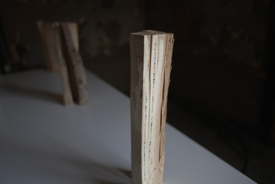 振り返る」という構想併置は、日々のみつめから選ばれたテキスト断片と採取素材によるインスタレーションと、