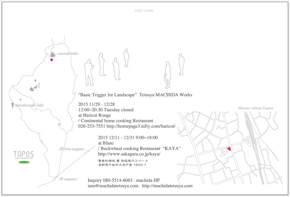 当初写真展をトポス高地で、オブジェによる小型作品でのインスタレーションを場所柄及び時節柄X'masなどに合わせ、企画側の要請もあり廉価な小作品群をと気軽に考えていた。とりかかってみればここ数年の自らの系の時間軸を戻りつ先へ行って、検証と予兆の狭間で手元を動かす時間が制作となり、中途で計画を大幅に変更し、同時期に行うふたつの場所で系の拡張をと考えた。