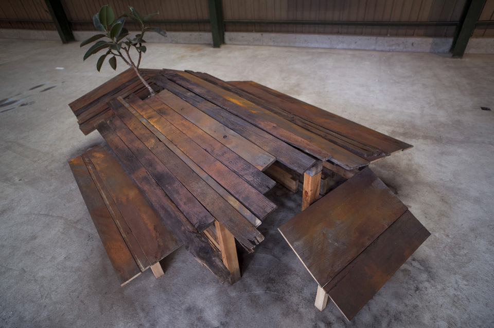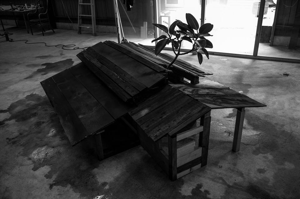 家識草 -フィカス・バーガンディのイエガタ - Ficus Burgundy,Old Wood, Iron Sand 1200 mm high x 3000 mm wide x 2000 mm depth 2015 –