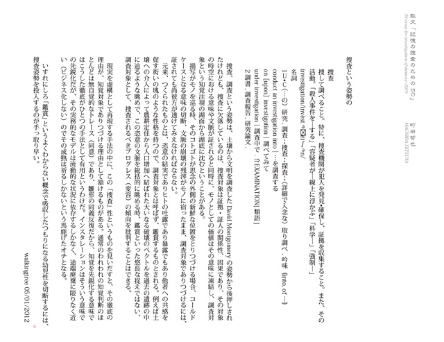 よって個人的な進捗に従うしかない作品展は、コールドケース(事件)を追う刑事の捜査部屋壁面に証拠が重なり並ぶ様相と似たものになるだろうと、他人事のように惚けて「*(記憶の)捜査」というタイトルを与えました。